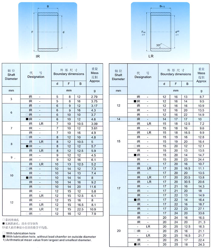 LR內(nèi)圈(套圈)的公差值大于IR內(nèi)圈,端面未經(jīng)磨削,價格也較低,常與沖壓外圈滾針軸承配合使用。
